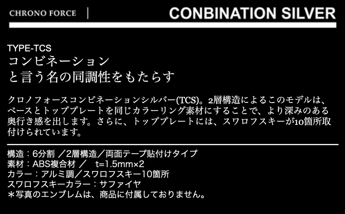 クロノフォースコンビネーションシルバー(TCS)。2層構造によるこのモデルは、ベースとトッププレートを同じカラーリング素材にすることで、より深みのある奥行き感を出します。さらに、トッププレートには、スワロフスキーが10箇所取付けられています。